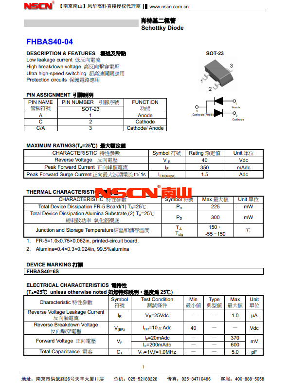 FHBAS40-04参数:反向电压40V,正向峰值电流350mA,正向最大浪涌电路1.5A。总耗散功率300mw